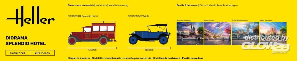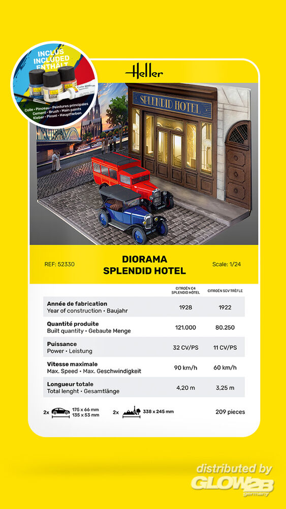 Diorama Splendid Hotel - Bemalt und patiniert, möglicherweise mit Dekorelementen erweitert können Sie mit diesem Zubehör und einem Minimum an Arbeit, eine ideale Präsentationsszenerie für Ihre Modelle gestalten. Sie haben die Möglichkeit zur Gestaltung der Häuserfront in ein „Splendid Hotel“, mit Blick in die Eingangshalle. Die ersten Gäste fahren mit Ihrem eigenen PKW, einem Citroen 5CV Trèfle, vor das Hotel. Dieses Fahrzeug war mit drei Sitzen ausgestattet, bei dem die Anordnung der Insassen an ein Kleeblatt erinnerte, und so erhielt er dieses als Beinamen. Die Fahrzeugkarosserie bestand aus Holz, auf dem das vorgeformte Blech aufgenagelt wurde. Die Pedale waren aus Aluminium und der Innenraumboden war mit einer schwarzen Fußmatte verkleidet. Der Citroën hatte nur eine Tür auf der rechten Seite, der Fahrersitz war festgestellt, der Beifahrersitz konnte jedoch auf Schienen verschoben werden. Das wasserdichte Verdeck stützte sich auf Holzpfosten und der Motor von 850 cm³ konnte das Auto auf bis zu 60 km/h beschleunigen. Die anderen Hotel Gäste werden vom Bahnhof mit dem Citroen C4 „Splendid Hotel“ abgeholt. Dieser zum Hotel gehörende Kleinbus, fuhr die Gäste und Ihr Gepäck zwischen Bahnhof und Hotel hin und zurück. Mit einer für die damalige Zeit völlig neuen Technik und inspiriert von amerikanischen Konstruktionstechniken, waren die C.4 sowohl beim Motor als auch bei der Karosserie äußerst robuste Fahrzeuge. Die steuerliche Nutzleistung von 9 PS stieg auf 10 PS an, blieb dann lange Zeit unverändert und wurde schließlich wieder auf 9 PS reduziert. Aufgrund der Vielzahl der von CITROËN angebotenen Karosserien war für jeden Bedarf etwas dabei: Limousinen, 4- und 6-Sitzer, Coupé, Cabriolets, Roadster, kommerzielle Roadster, Kleintransporter, Kleinbusse/Taxi usw. Zusatzinformationen