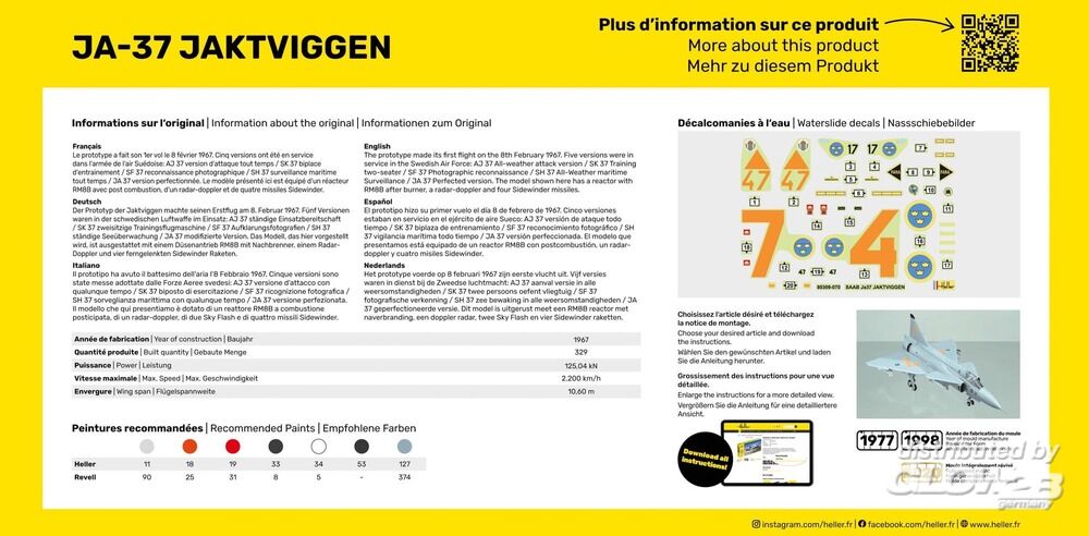 Der Prototyp der Jaktviggen machte seinen Erstflug am 8. Februar 1967. Fünf Versionen waren in der schwedischen Luftwaffe im Einsatz: AJ 37 ständige Einsatzbereitschaft / SK 37 zweisitzige Trainingsflugmaschine / SF 37 Aufklarungsfotografien / SH 37 ständige Seeüberwachung / JA 37 modifizierte Version. Das Modell, das hier vorgestellt wird, ist ausgestattet mit einem Düsenantrieb RM8B mit Nachbrenner, einem Radar-Doppler und vier ferngelenkten Sidewinder Raketen. Zusatzinformationen