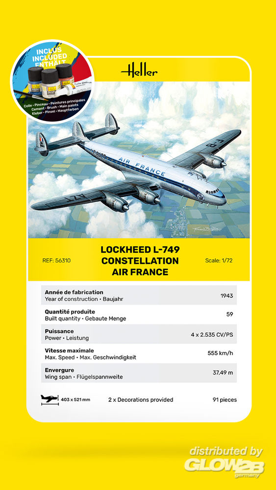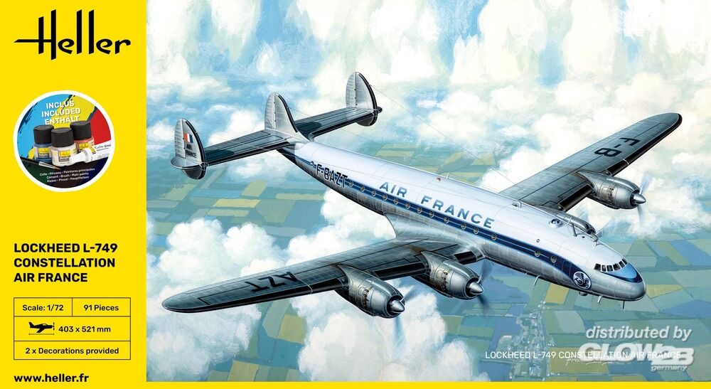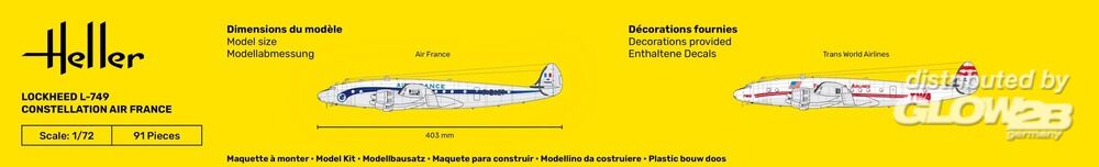 Besonderheiten des Heller Bausatzes: 2 Decalversionen: - Air France - TWA - Trans World Airlines ------- 1939 wurde auf Antrag der Firma T.W.A. das Projekt Constellation aufgenommen. Diese Gesellschaft wünschte ein Transportflugzeug von 40 Plätzen. Der Prototyp flog zum ersten Mal am 9 Januar 1943. Aufgrund des Kriegszustandes begann die Constellation ihre Karriere unter einer militärischen Bezeichnung, C-69, und wurde im AIR TRANSPORT COMMAND der U.S.A. - Luftwaffe eingesetzt. Nach dem Krieg waren die ersten beiden zivilen Kunden die T.W.A. und die Pan American. Diese letztere setzte als erste Fluggesellschaft ihre Constellation auf der Linie New-York-Bermudas ein. Die T.W.A. ihrerseits eröffnete am 6. Februar 1947 die erste Verbindung U.S.A. - Europa. Zusatzinformationen