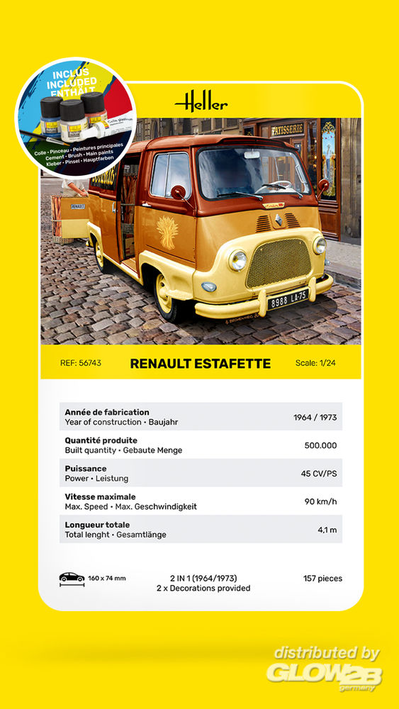 (mit Pinsel, Farbe, Kleber) • 2 IN 1: Baujahr 1964 oder 1973 baubar • Türen offen/geschlossen darstellbar • Heckklappe offen/geschlossen darstellbar • Motornachbildung Es wird oft angenommen, dass der Renault 4 (Ref. Heller 80759), der 1961 auf den Markt kam, das erste Auto mit Vorderradantrieb von Renault war. Dies ist nicht der Fall. Es war das Nutzfahrzeug Renault Estafette aus dem Jahr 1959. Die französischen Konkurrenten waren zu dieser Zeit der Peugeot D3A/D4B und der Citroën Typ H (Ref. Heller 80768). Die Estafette basierte auf dem Frontantriebssystem des Citroën, das somit eine große, flache Ladefläche, vier Einzelradaufhängungen, eine seitliche Schiebetür und eine dreiflügelige Hecktür bot. Zusatzinformationen
