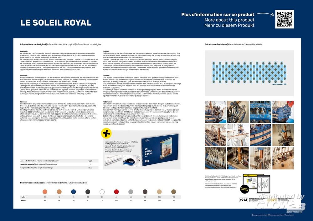 Bei diesem Modell handelt es sich um das erste von drei Schiffen einer Linie, die diesen Namen in der französischen Marine trugen. Sie zeichnete sich unter Tourville aus, der sie beim Sieg von Béveziers am 10. Juli 1690 und in der Schlacht von Barfleur am 29. Mai 1692, führte. Diese erste Soleil Royal wurde 1669 in Brest nach den Plänen von L. Hubac für eine ursprüngliche Tonnage von 2000 Tonnen gebaut und war für 104 Kanonen ausgelegt. Die Skulpturen, die das Schiff schmückten, wurden Coysevox zugeschrieben. Die Experten für Marinegeschichte hatten die „Soleil Royal“ gründlich erforscht: Sie hatten alle ihre eigenen Theorien aufgestellt und waren sich uneinig. Alle authentischen Dokumente waren verschwunden. Das HELLER Modell löste unter den damaligen Fachleuten große Emotionen aus, auch wenn neue Elemente hinzufügt wurden. Hinweis: Die auch separat erhältliche Anleitung ist beim Kauf des Modellbausatzes bereits enthalten und muss nicht zusätzlich gekauft werden. Zusatzinformationen