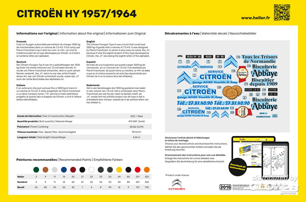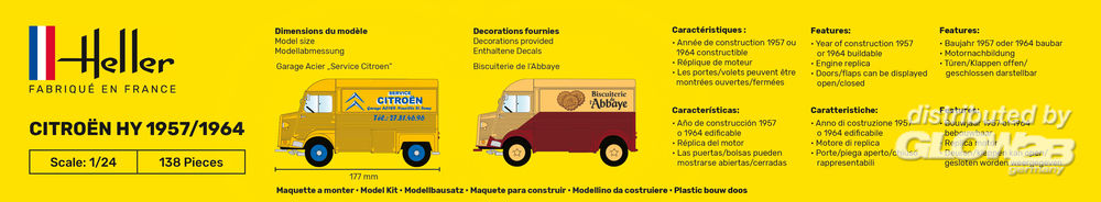 NEUE DECALS Die Garage ACIER befindet sich in der 128 Rue de Lille in Neuville Saint Rémy, vor den Toren von Cambrai (59). Sie entstand 1971 durch den Kauf einer PANHARD-Garage durch das Ehepaar Acier. Von einem Familienbetrieb mit einem Mitarbeiter, ist es heute eine GmbH mit 6 Mitarbeitern und einem Lehrling geworden. Der CITROËN Fourgon Typ H ist ein Lastkraftwagen, der 1200 kg Güter mit einem Volumen von 7,3 m³ laden kann. Er wurde von Pierre Franchiset entworfen, dem er seinen Namen verdankt, das „H“, weil es das achte Projekt dieser Art ist, das von Citroën entwickelt wurde, wobei das „H“ der achte Buchstabe des Alphabets ist. Beispiel Modell:Guido Kehder Zusatzinformationen