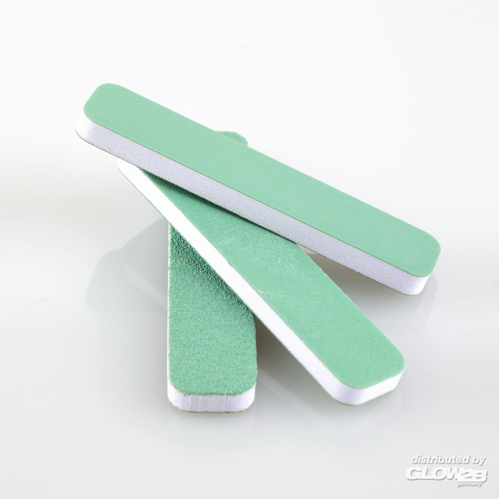 Drei Sandfeilen im Set mit jeweils zwei Seiten. Körnung in grob (60/100) zum Materialabtrag, in mittel zum Glätten (240/400) und in fein zum Polieren (600/1000).