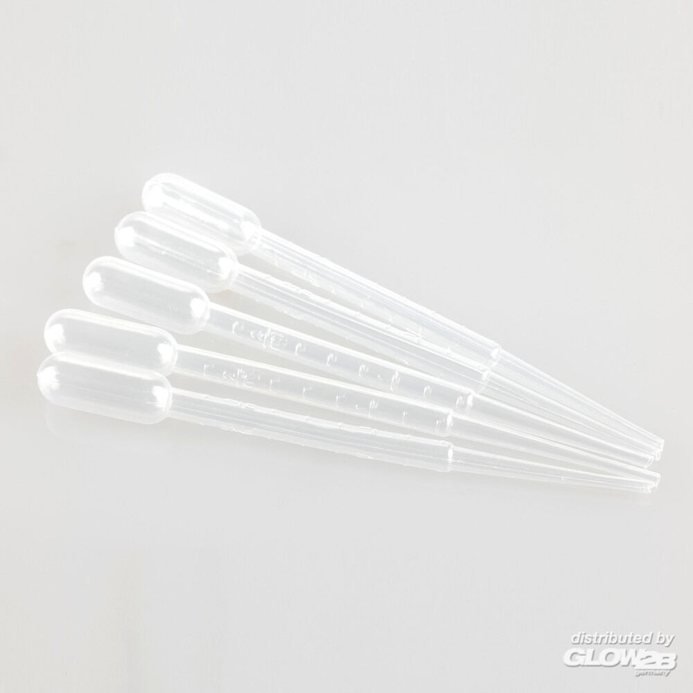 Set mit fünf 2ml-Pipetten, perfekt für die präzise Anwendung von Farben und Verdünnern. Die Pipetten verfügen über eine Milliliter-Skala zur genauen Dosierung.