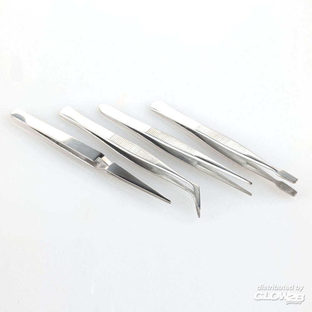 Pinzetten-Set mit vier häufig benötigten Spitzen (Nadel-, Winkel-, gerade und flache Spitze) aus rostfreiem Stahl. Perfekt für präzises und kontrolliertes Picken.