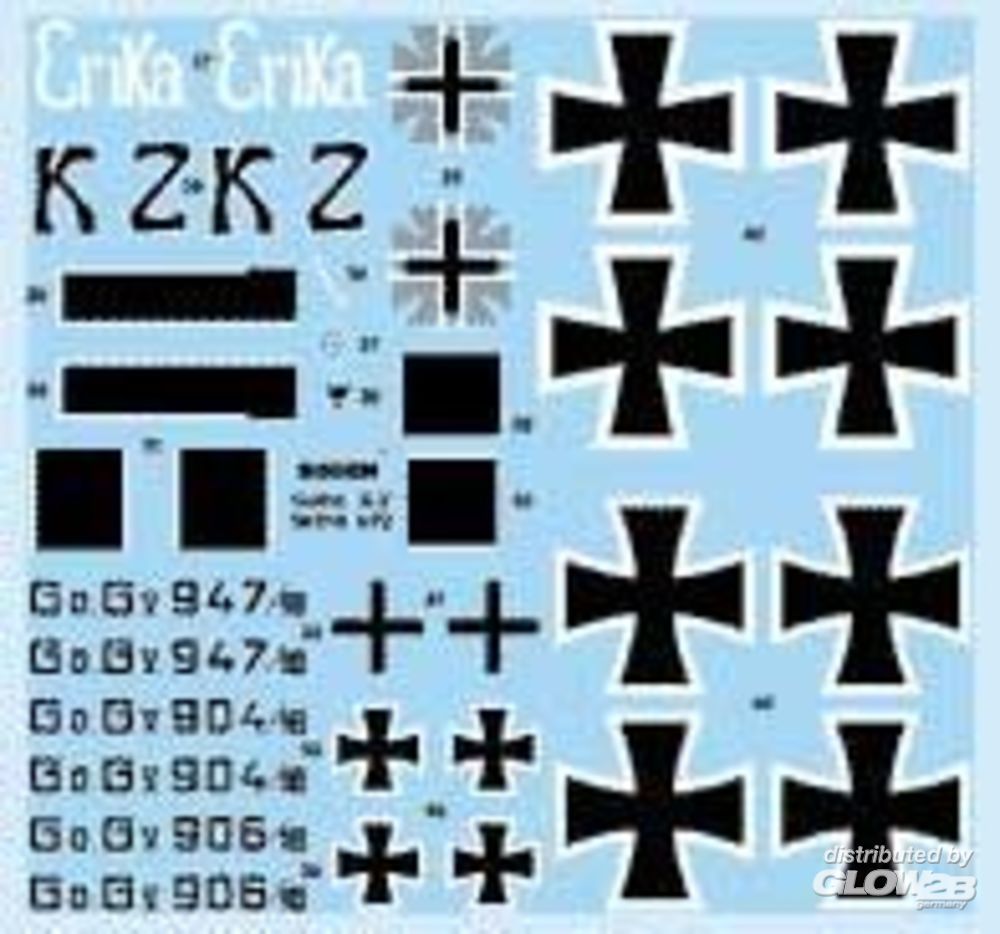 Fein detaillierter Bausatz mit Decals für Tarnstoff (Lozengetarnung). Baubar in 3 Markierungsvarianten, alle von der Bogohl 3: 904/16, "Erika", 1918 (Wie Deckelbild), 947/16, 1918, 906/16, 1917. Der Gotha G V war ein ab 1916 in Serie gebauter, vorwiegend gegen England eingesetzter, strategischer Bomber. Eine Besonderheit war der nach hinten unten teilweise offene Rumpf, damit ein Schusskanal für das obere hintere MG die Abwehr von Jägern im sonst toten Winkel des Bombers ermöglichte.