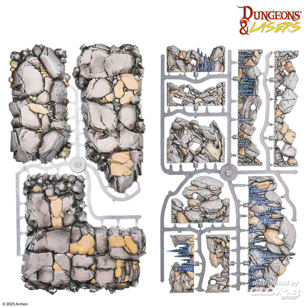 Wagt euch ins Herz alter Felsformationen und bahnt euren Weg durch verschlungene Tunnel und versteckte Kammern. 20 x einzelne Böden 15 x gebogene Wände 5 x doppelte Böden 6 x einzelne Wände 3 x doppelte Wände 4 x Ecken 2 x Geländestücke 3 x Hügel Zusatzinformationen