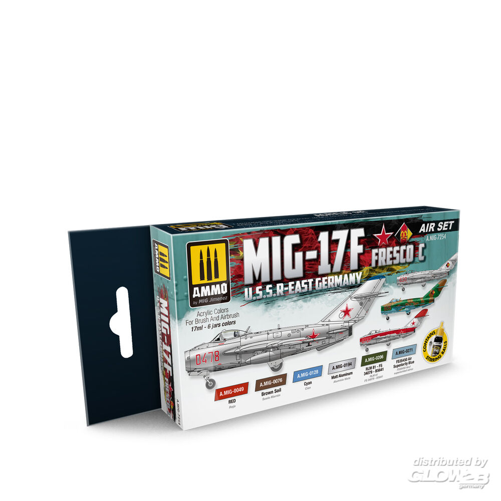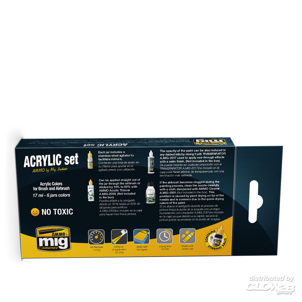 1 x ACRYLIC COLOR Brown Soil (A.MIG-0076) 1 x ACRYLIC COLOR Cyan (A.MIG-0128) 1 x METALLIC Matt Aluminium (A.MIG-0194) 1 x ACRYLIC COLOR FS-34079 (BS 641) (A.MIG-0206) 1 x ACRYLIC COLOR FS-35450 Air Superiority Blue (A.MIG-0271) Zusatzinformationen