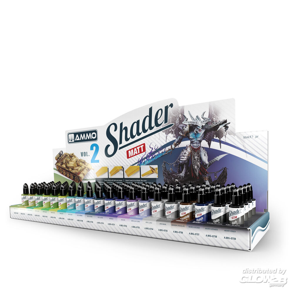 4 x MATT SHADER Light Olive Draw (A.MIG-0741) 4 x MATT SHADER Goblin Green (A.MIG-0742) 4 x MATT SHADER Light Green (A.MIG-0743) 4 x MATT SHADER Lime Green (A.MIG-0744) 4 x MATT SHADER Bile Green (A.MIG-0745) 4 x MATT SHADER Turquoise (A.MIG-0746) 4 x MATT SHADER Sky Blue (A.MIG-0747) 4 x MATT SHADER Marine Blue (A.MIG-0748) 4 x MATT SHADER Night Blue (A.MIG-0749) 4 x MATT SHADER Ultra Blue (A.MIG-0750) 4 x MATT SHADER Purple (A.MIG-0751) 4 x MATT SHADER Violet (A.MIG-0752) 4 x MATT SHADER Light Lilac Grey (A.MIG-0753) 4 x MATT SHADER Light Grey (A.MIG-0754) 4 x MATT SHADER Navy Grey (A.MIG-0755) 4 x MATT SHADER Chocolate Brown (A.MIG-0756) 4 x MATT SHADER Bluish Black (A.MIG-0757) 4 x MATT SHADER Satin Black (A.MIG-0758) 4 x MATT SHADER Ash Black (A.MIG-0759) Zusatzinformationen