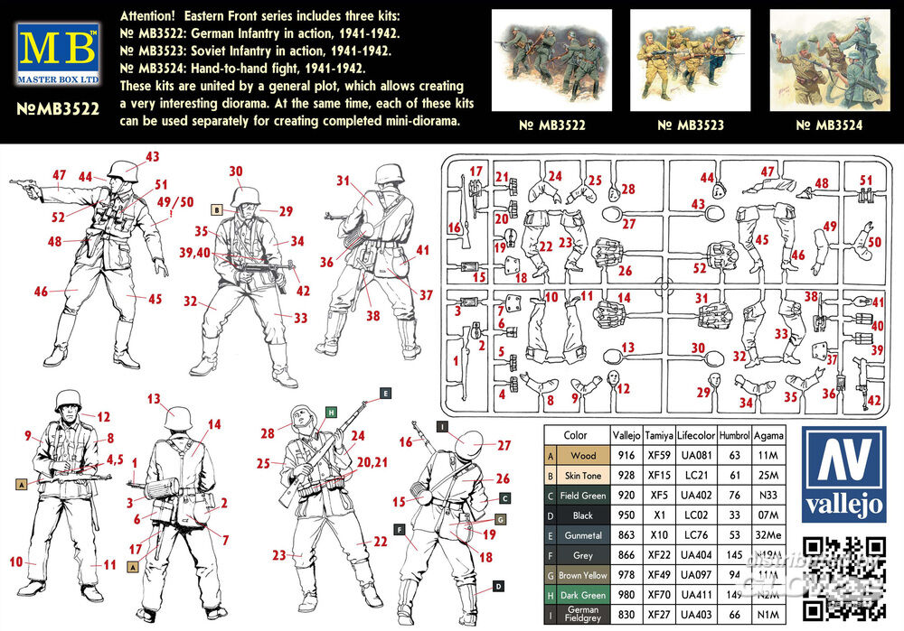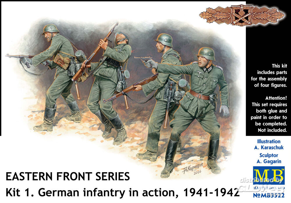Die 4 Figuren der Landser sind dank separater Arme, Beine und Köpfe in unterschiedlichen Haltungen baubar. Mit Waffen und Zubehör. Bauanleitung mit Farbschlüssel auf der Packungsrückseite, das Deckelbild liefert weitere Informationen für die Detailbemalung. German Infantry in action 1941-1942 Eastern Front Series Kit No. 1