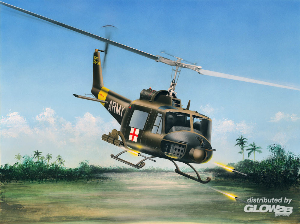 Baubar in 2 Markierungsvarianten: UH-1B Medical Detachment in Vietnam, UH-1B of the 117th Aviation Company, Vietnam, 1964. Mit beweglichem Rotor und farbiger Bemalungsanleitung.