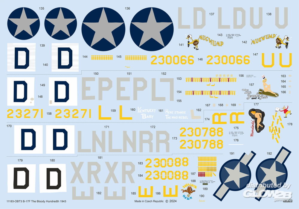 - Extra Spritzling für 2 alternative B-17F Bugvarianten, inklusive Astrodome und Wangenkanonenfenster, entwickelt in Zusammenarbeit mit HK Models nach Eduard Design. - Neue Form, erste Veröffentlichung. - Fotogeätzte Details (Armaturenbrett, kleine Cockpitdetails, Sicherheitsgurte, Motordetails und Kanonenscheiben) und gestanzte Masken. - Eduard Brassin B-17F Auspuffanlagen und Kompressoren. - Abziehbilderbogen mit 7 Markierungen von B-17Fs der 100th Bomb Group aus den Jahren 1943 bis 1944. - Diese Ausgabe unterstützt die Museums- und Bildungsprojekte der 100th BG Foundation. Zusatzinformationen