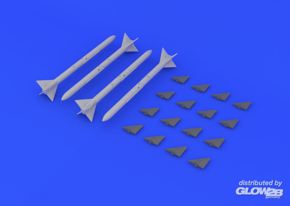 - 4 Stück semi-aktive radargesteuerte Luft-Raketen mittlerer Reichweite AIM-7E Sparrow. Fotogeätzte Details und Abziehbilder enthalten. Zusatzinformationen