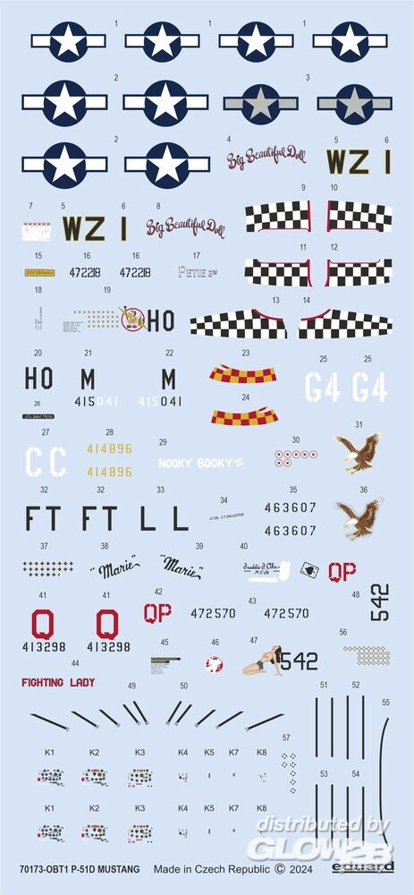 ProfiPACK edition kit of US WWII fighter aircraft P-51D version D-10 and higher in 1/72 scale. The kit is focused on machines of the top aces of the 8th, 9th, 15th and 20th USAAF. Plastic parts: Eduard - marking options: 6 - decals: Eduard - PE parts: yes, pre-painted - painting mask: yes