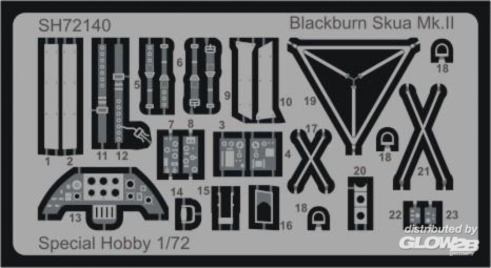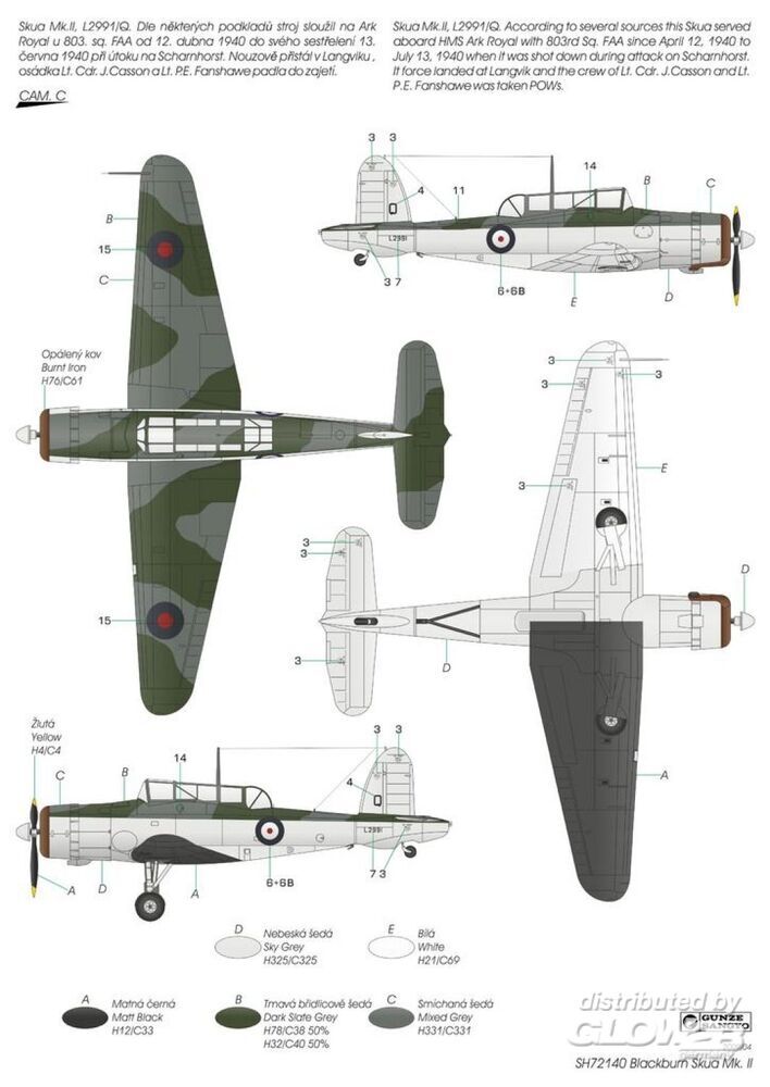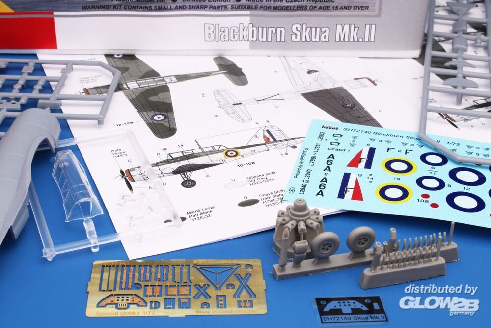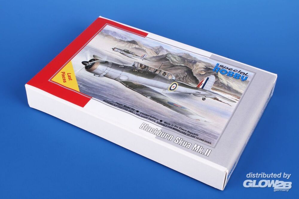 Nach dem damaligen britischen Konzept war ein trägergestützter Jäger ein Zweisitzer, ausgelegt für lange Einsatzflüge und den Kampf gegen feindliche Aufklärungsflugzeuge. Ein Einsatz gegen feindliche Bomber oder gar Jäger war nicht vorgesehen. Das vom Chefkonstrukteur der Firma Blackburn, Ing. G. E. Petty, entwickelte B.24-Projekt wurde als das beste ausgewählt. Petty entwarf ein Tiefdecker-Flugzeug aus Metall mit einklappbaren Tragflächen und einziehbarem Fahrwerk. Unter dem Rumpf befanden sich ein Fanghaken sowie eine Bombeinbuchtung für eine Bombe von bis zu 226 kg. Der erste Prototyp, später Skua Mk.I genannt, startete am 9. Februar 1937 zum Erstflug. Nach erfolgreichen Tests begann sofort die Serienproduktion. Die Serienmaschinen wurden von Bristol Perseus XII-Motoren angetrieben und als Skua Mk.II bezeichnet. Sie wurden an die Jagdgeschwader Nr. 800, 801, 803 und 806 geliefert und auch in Schul- und Zielschleppstaffeln eingesetzt. Trotz der eiligen Produktion galten die Flugzeuge in der Rolle als Jäger bereits als veraltet. Mit dem Ausbruch des Zweiten Weltkriegs kamen die Skuas jedoch sofort zum Einsatz – sowohl von Flugzeugträgern als auch von Landbasen aus. Beim ersten Bombenangriff auf ein deutsches U-Boot am 14. September 1939 gingen zwei Skuas einer dreimaschinigen Formation durch mangelhafte Bombenqualität verloren. Am 26. September schossen zwei Flugzeuge des No. 803 Squadron ein feindliches Dornier Do 18-Flugboot ab – der erste bestätigte britische Luftsieg des Zweiten Weltkriegs. Die Skua ist zudem mit mehreren weiteren „Premieren“ verbunden. Während des Norwegenfeldzugs am 10. April 1940 versenkten sechzehn Skuas den deutschen Kreuzer Königsberg. Das Geschwader No. 800 unter dem Kommando von Capt. R. T. Partridge und No. 803 unter Lt. W. P. Lucy starteten von Hatston auf den Orkney-Inseln – dies war der erste erfolgreiche Luftangriff auf ein Kriegsschiff im Zweiten Weltkrieg. Skuas nahmen auch an der Schlacht von Dünkirchen teil und kämpften an Bord der HMS Ark Royal im Mittelmeerraum. Dort kam es am 3. Juli 1940 zu einem weiteren historischen Ereignis: Eine Skua der Ark Royal kämpfte gegen französische Flugzeuge – das erste britische Flugzeug, das gegen frühere Verbündete kämpfte, und zugleich das erste, das in diesem nicht erklärten Krieg verloren ging. Die letzten Skuas wurden im April 1941 von der HMS Ark Royal abgezogen und dienten danach nur noch in Nichtkampfeinheiten. Ihre Kampflaufbahn war relativ kurz, doch trotz der begrenzten Leistungsfähigkeit als Jäger erzielten mehrere Piloten auf ihnen mehr als fünf Abschüsse. Als Bomber hätten sie deutlich erfolgreicher sein können, wurden jedoch von der Admiralty nicht angemessen eingesetzt – zum Nachteil der Royal Navy. Das Modell kehrt nach mehreren Jahren wieder ins Sortiment zurück. Zwei Spritzrahmen aus grauem Kunststoff werden ergänzt durch einen Rahmen mit Klarsichtteilen, Fotoätzteile und detaillierte PUR-Komponenten. Die Decals bieten Markierungen für drei Flugzeuge im FAA-Tarnschema. Zusatzinformationen