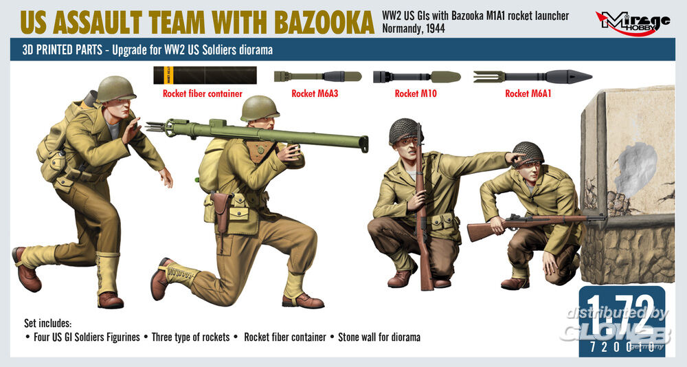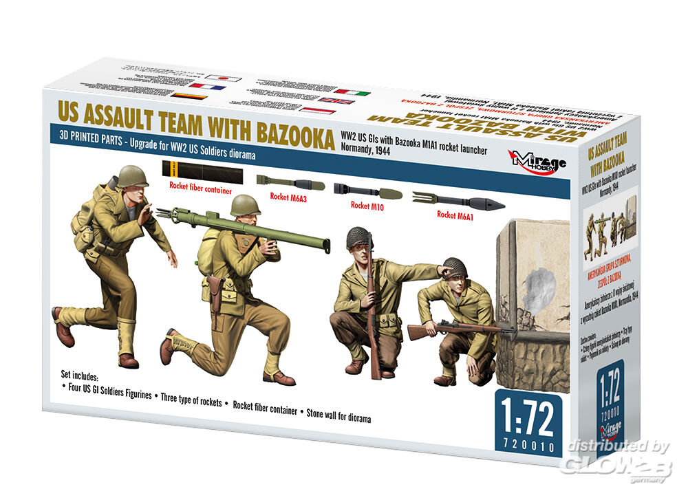 Mirage Hobby: US ASSAULT TEAM WITH BAZOOKA, WW2 US GIs with Bazooka M1A1 rocket launcher Normandy, 1944 in 1:72 [4072010]