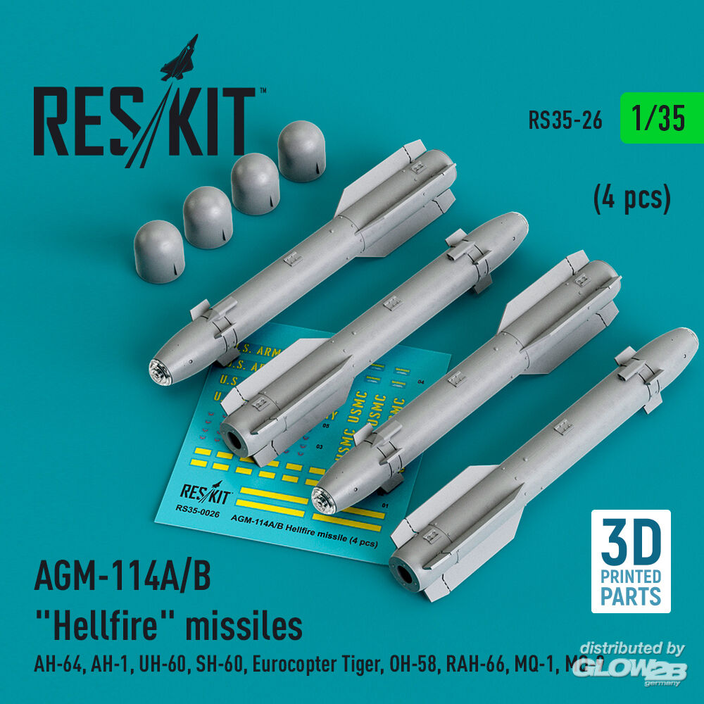 ResKit Models: AGM-114A/B Hellfire missiles (4 pcs) (AH-64, AH-1, UH-60, SH-60, Eurocopter Tiger, OH-58, RAH-66, MQ-1, MQ-9) (3D Printed) in 1:35 [4592100261]