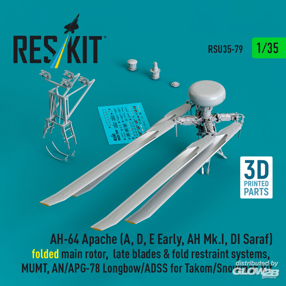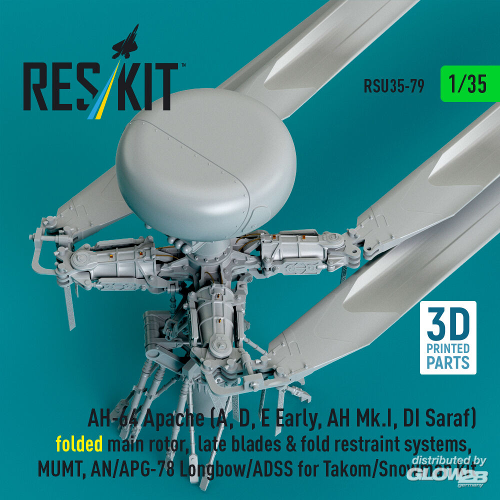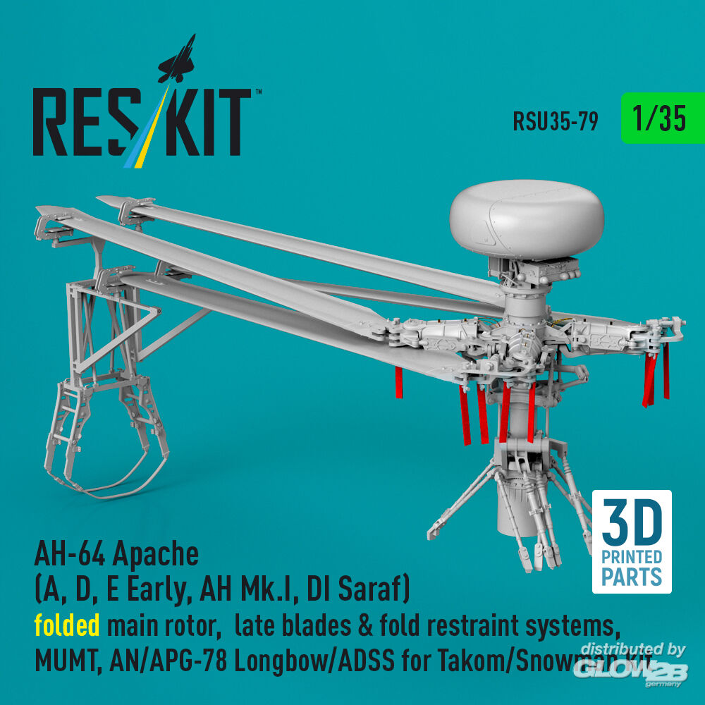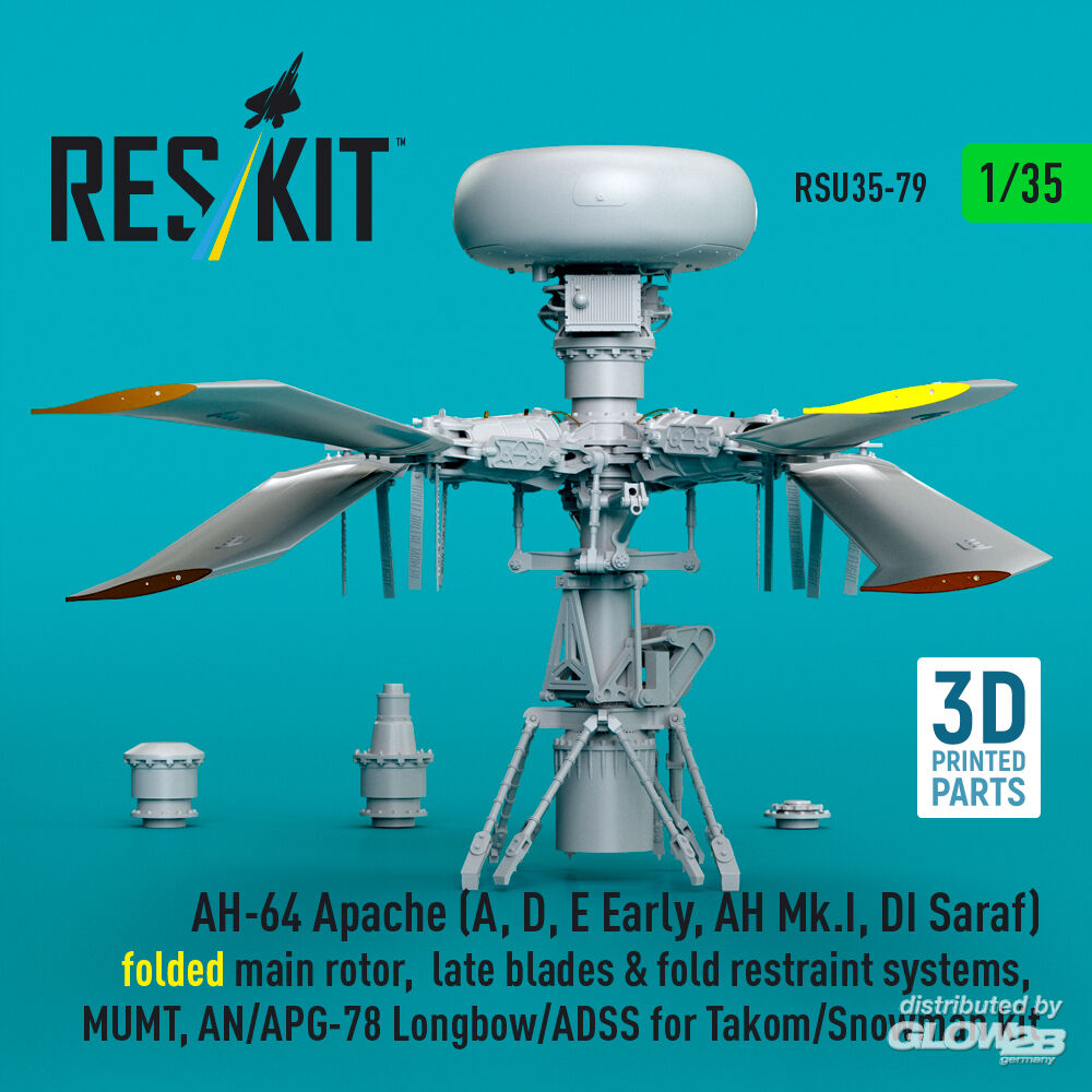 ResKit Models: AH-64E late Apache folded main rotor, late blades & fold restraint systems, MUMT, AN/APG-78 Longbow for Takom/Snowman kit (3D Printed) in 1:35 [4592200794]
