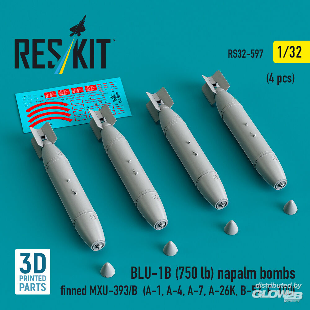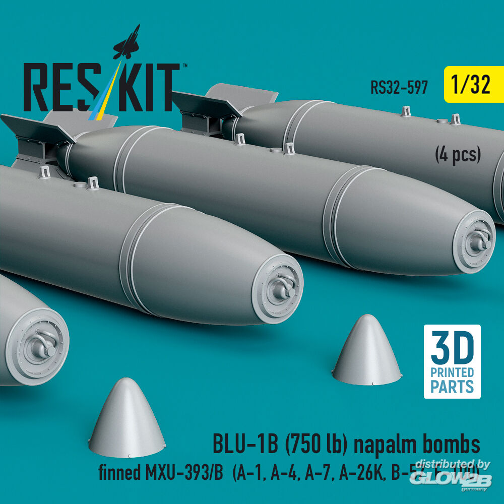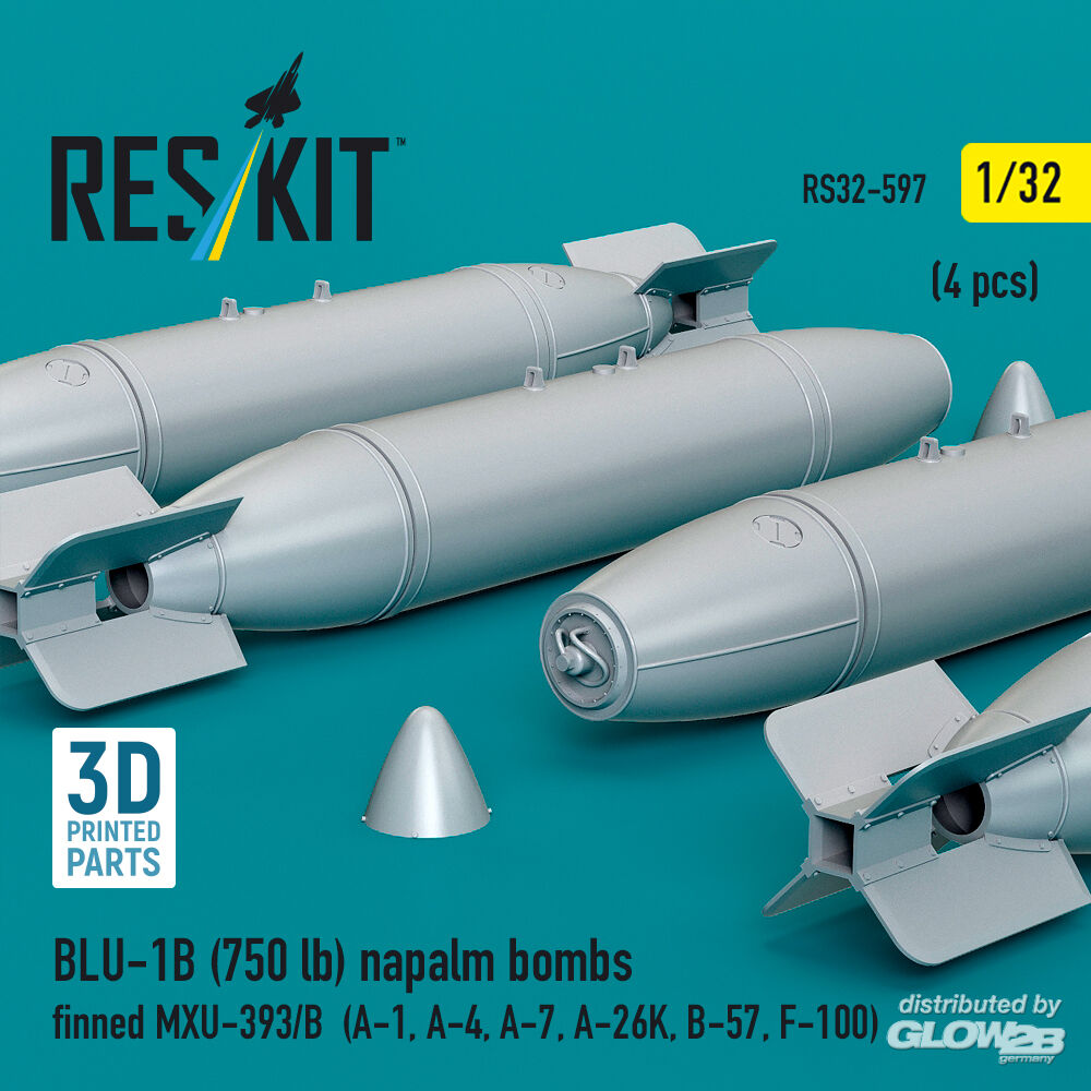 ResKit Models: BLU-1B (750 lb) napalm bombs finned MXU-393/B (4 pcs) (A-1, A-4, A-7, A-26K, B-57, F-100) (3D Printed) in 1:32 [4593105975]