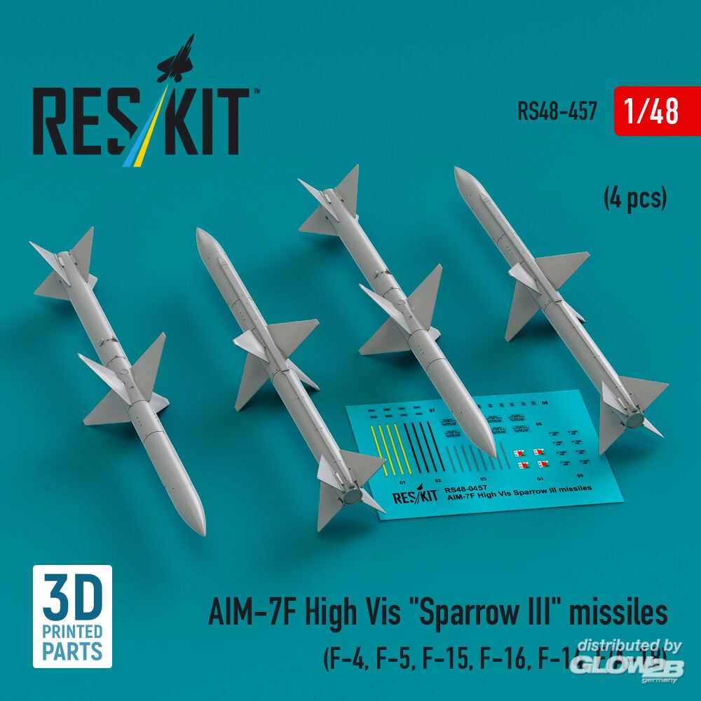 ResKit Models: AIM-7F High Vis Sparrow III missiles (4 pcs) (F-4, F-5, F-15, F-16, F-14, F/A-18) (3D Printed) in 1:48 [4594104571]
