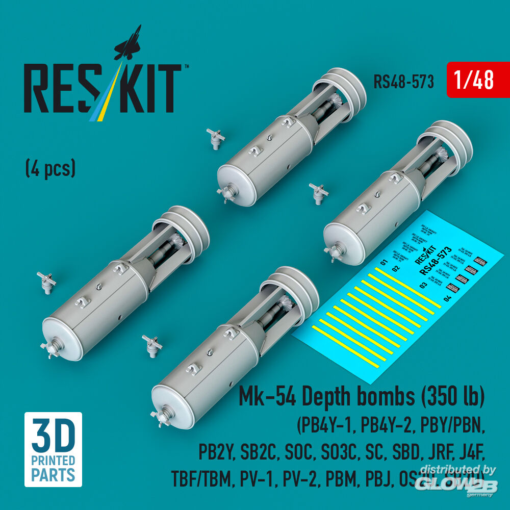 ResKit Models: Mk-54 Depth bombs (350 lb) (4 pcs) (PB4Y-1, PB4Y-2, PBY/PBN, PB2Y, SB2C, SOC, SO3C, SC, SBD, JRF, J4F, TBF/TBM, PV-1, PV-2, PBM, PBJ, OS2U, SB2U) (3D Printed) in 1:48 [4594105738]