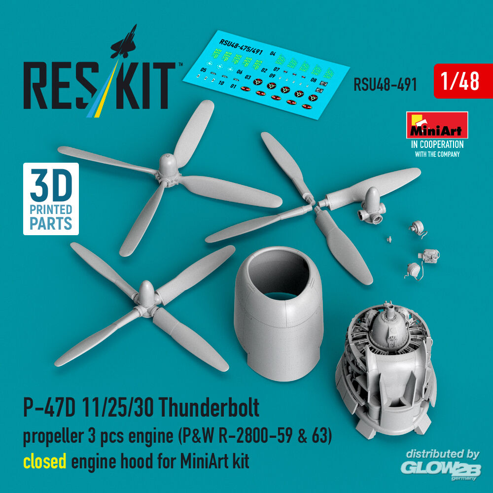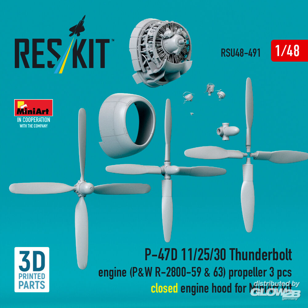 ResKit Models: P-47D 11/25/30 Thunderbolt propeller (3 pcs), engine (P&W R-2800-59 & 63) closed engine hood for MiniArt kit (3D Printed) in 1:48 [4594204912]