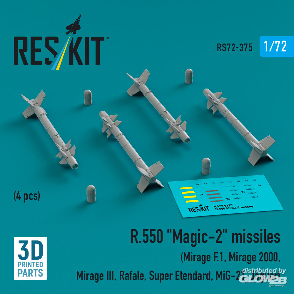 ResKit Models: R.550 Magic-2 missiles (4 pcs) (Mirage F.1, Mirage 2000, Mirage III, Rafale, Super Etendard, MiG-21, Jaguar) (3D Printed) in 1:72 [4595103757]
