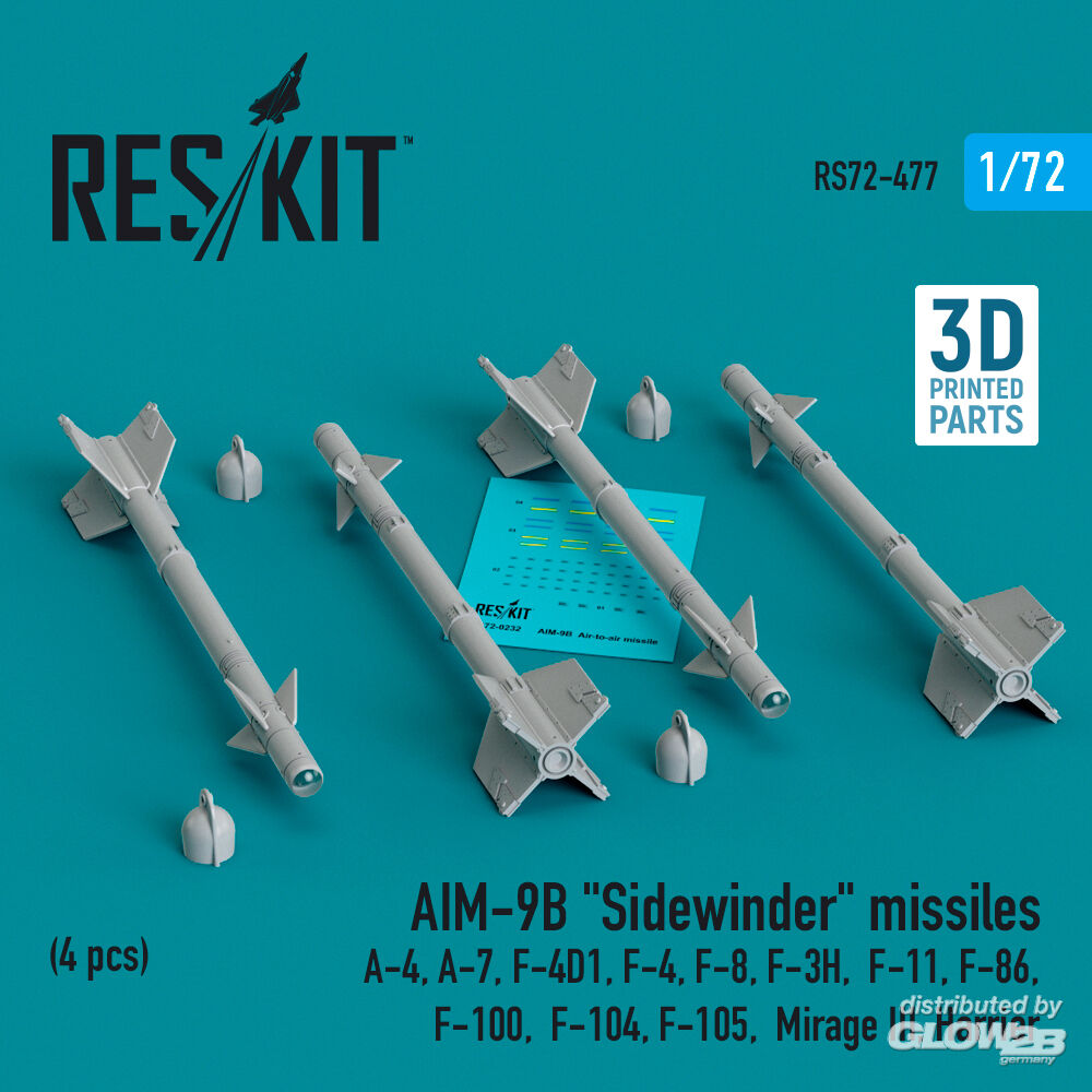 ResKit Models: AIM-9B Sidewinder missiles (4 pcs) (A-4, A-7, F-4D1, F-4, F-8, F-3H, F-11, F-86,F-100, F-104, F-105, Mirage III, Harrier) (3D Printed) in 1:72 [4595104778]