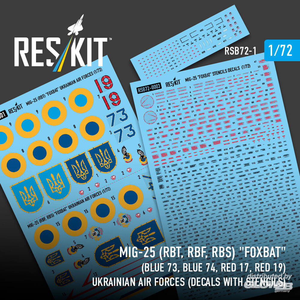 ResKit Models: MiG-25RBT, RBF, RBS Foxbat (Blue 73, Blue 74, Red 17, Red 19) Ukrainian Air Forces (Decals with Stencils) in 1:72 [4595800014]