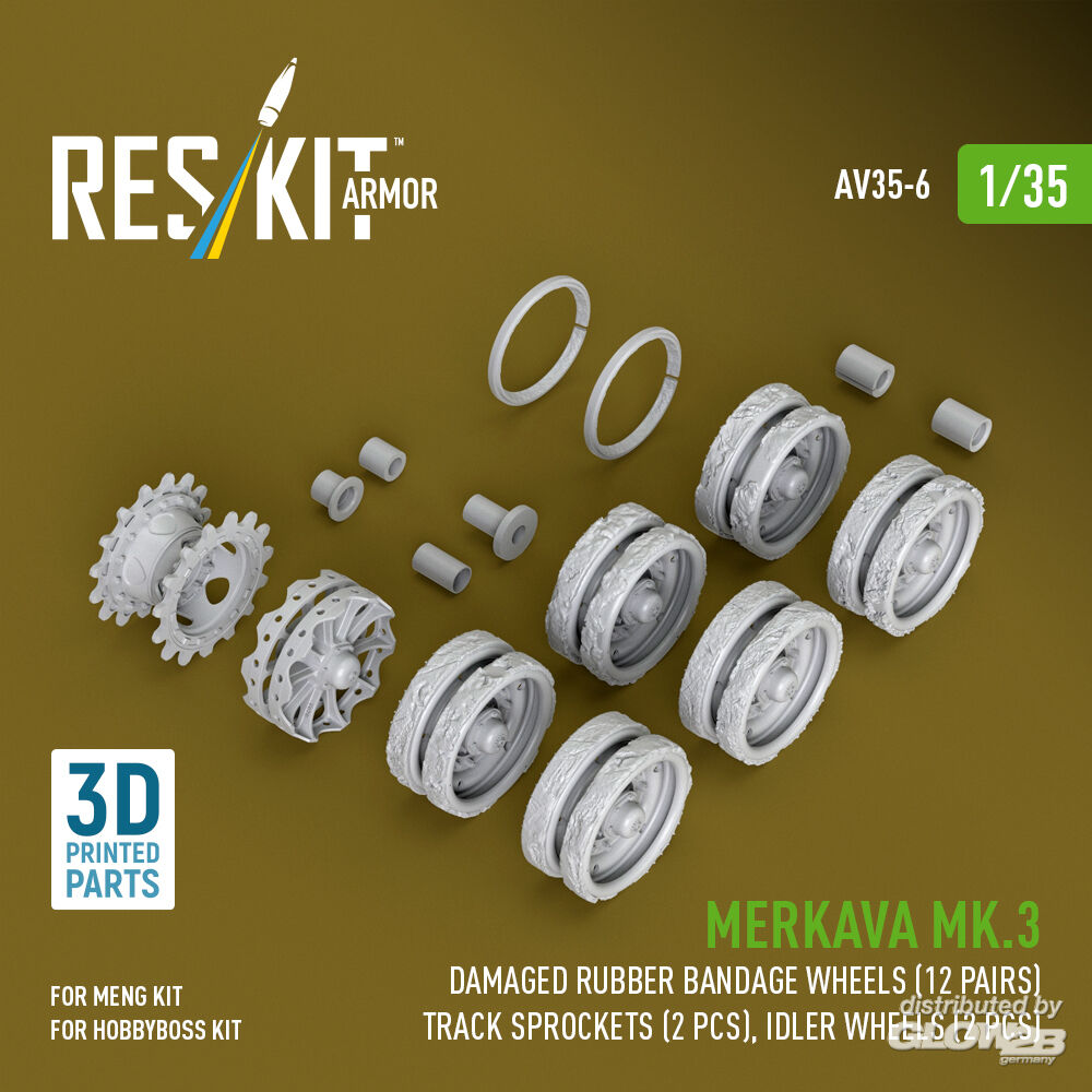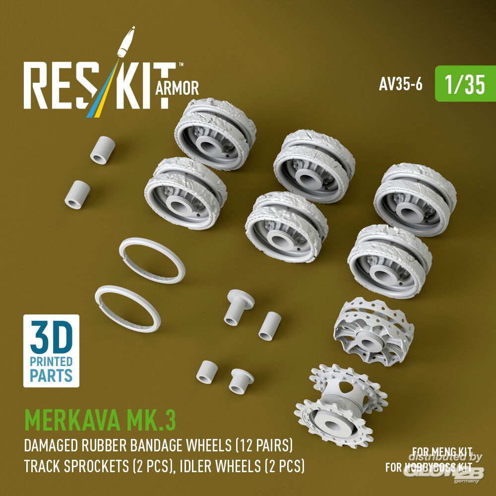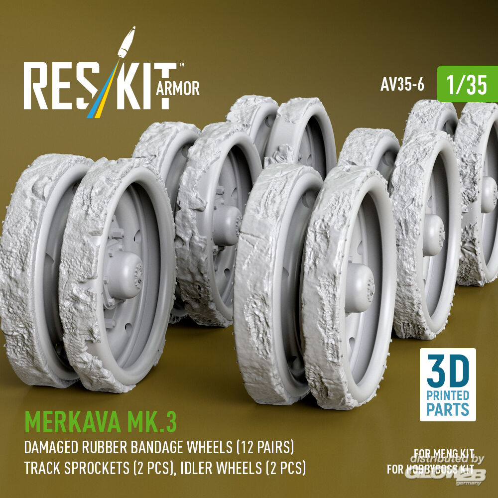 ResKit Models: Merkava Mk.3 damaged rubber bandage wheels (12 pairs), track sprockets (2 pcs), idler wheels (2 pcs) for Meng/HobbyBoss kit (3D Printed) in 1:35 [4711100066]
