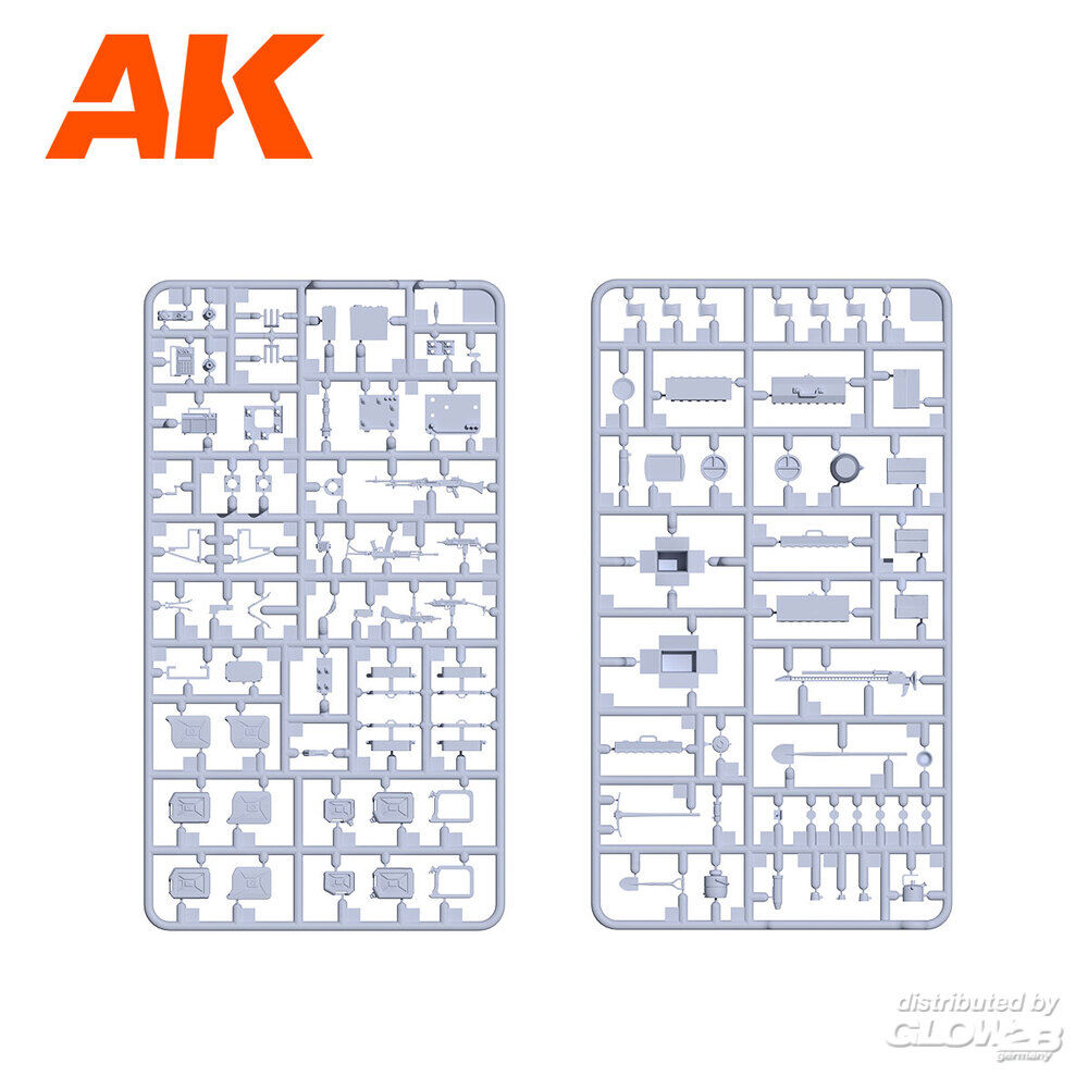 Viele der enthaltenen Teile sind universell einsetzbar und können für nahezu jede Szene verwendet werden, die Sie gestalten möchten. Im Lieferumfang befinden sich zwei Spritzlinge aus Kunststoff, die sowohl strikt militärische Gegenstände enthalten, wie Waffen (einschließlich verschiedener Varianten der berühmten UZI, eines Galil-Gewehrs und einer FN-MAG-Maschinengewehr), verschiedene Funkgeräte und Fahrzeugantennenhalterungen, Benzin- und Wasserkanister, Verpflegungspakete, Dosen und Beutel, als auch universell nutzbare Gegenstände wie Werkzeugkästen, Geschirr, Thermoskannen, Schaufeln, Hacken, Wagenheber, Eimer, Gaskocher, Kühlboxen usw. Die Kunststoffteile werden durch ein Abziehbilderblatt ergänzt, das verschiedene Beschriftungen, Sticker und Logos enthält und von der renommierten Firma Cartograf gedruckt wurde. Der letzte Bestandteil des Sets ist ein hochwertig gedrucktes Blatt, das verschiedene Karten, Zeitungen und Magazin-Cover enthält. Zusatzinformationen
