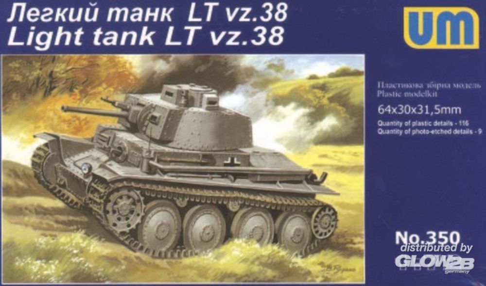 Mit Fotoätzteilen. Längere und kürzere Kettenglieder-Segmente bilden zusammengeklebt das Kettenlaufwerk. Decals für diverse Kennzeichen, unter anderem tschechischer und schwedischer Panzer. Farbangaben für 2 Panzer 38: 3. Slowakisches Reg. 1941, Slowak. Mobile Div. 1943.