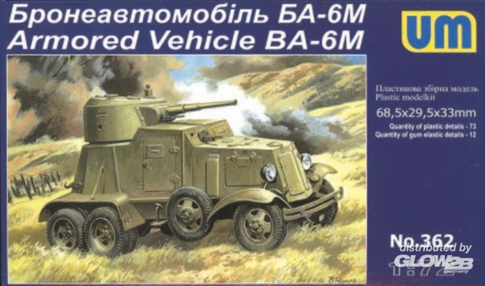 Mit detailiertem Fahrwerk und Decals mit Ziffern von 0 bis 9 (4 mal in weiß) sowie Propagandasprachen. Der Schützenpanzerwagen BA-6M hatte gegenüber seinem Vorgänger BA-6 eine geänderte Turmform, einen anders eingebauten Motor GAZ-M-1 von 50 PS und Ersatzräder, die seitlich drehbar montiert waren, um das Aufsetzen des Fahrzeuges im unebenen Gelände zu minimieren.