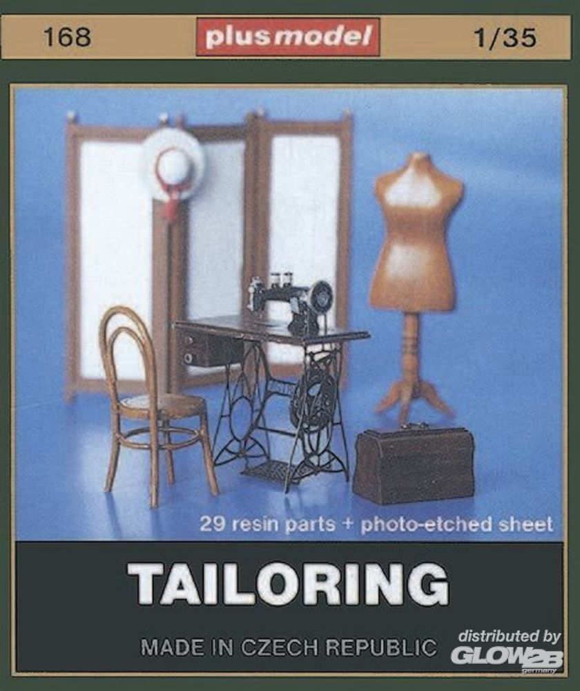 Dioramenset bestehend aus 29 Resinteilen und Fotoätzsatz. Schneiderpuppe, Nähmaschine, Stuhl, Paravent und Hut.