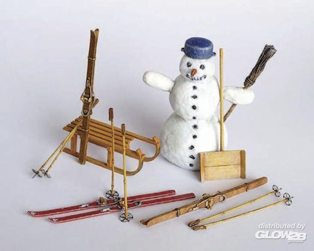 Mit Fotoätzteilen für die Teller der Skistöcke. Mit 3 Paar altmodischen Holzskiern, einem Schlitten, Schneeschaufel und einem Schneemann, der in der Frühlingssonne netterweise nicht schmilzt. Ein niedliches Set, das für zivile wie militärische Dioramen, aber auch für Puppenstubenszenen interessant ist.