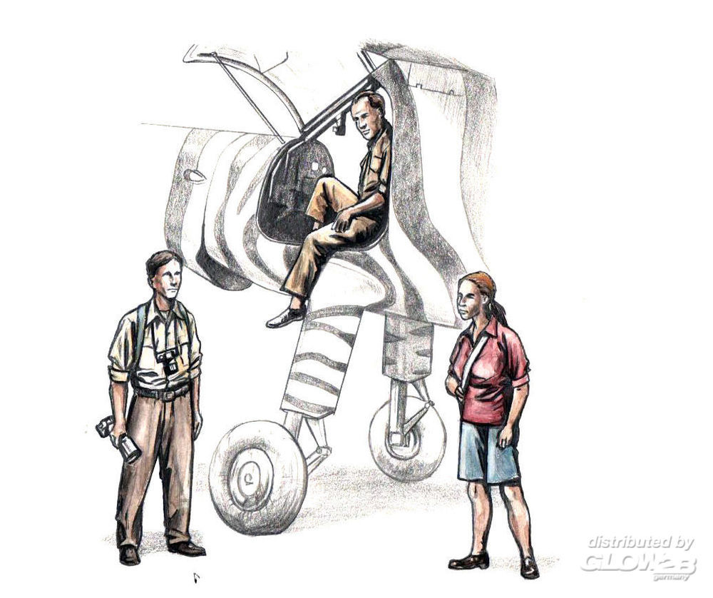 Zivilpersonen, die jedes Modell eines Flugzeugs der Nachkriegszeit beleben kann. Der Pilot wird von einem Fotografen begleitet, der zwei Kameras trägt und einer Zoologin. Nicht nur für die Special Hobby Dornier Do 27, sondern auch für jedes andere nicht militärische 1/72 Flugzeug geeignet. 1/72 Do-27 civilian crew (pilot, photographer with two cameras, zoologist) of resin. Civilians who can enliven any model of a post-war plane. The pilot is accompanied by a photographer who has two cameras and a zoologist. Not only suitable for the special hobby Dornier Do 27, but also for any other non-military 1/72 aircraft. Zusatzinformationen