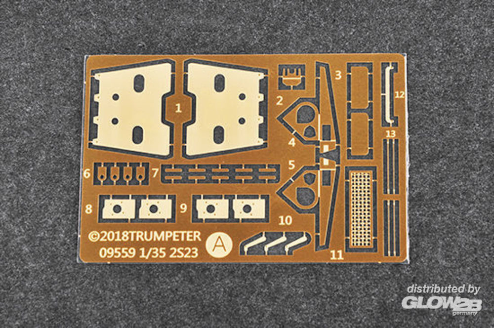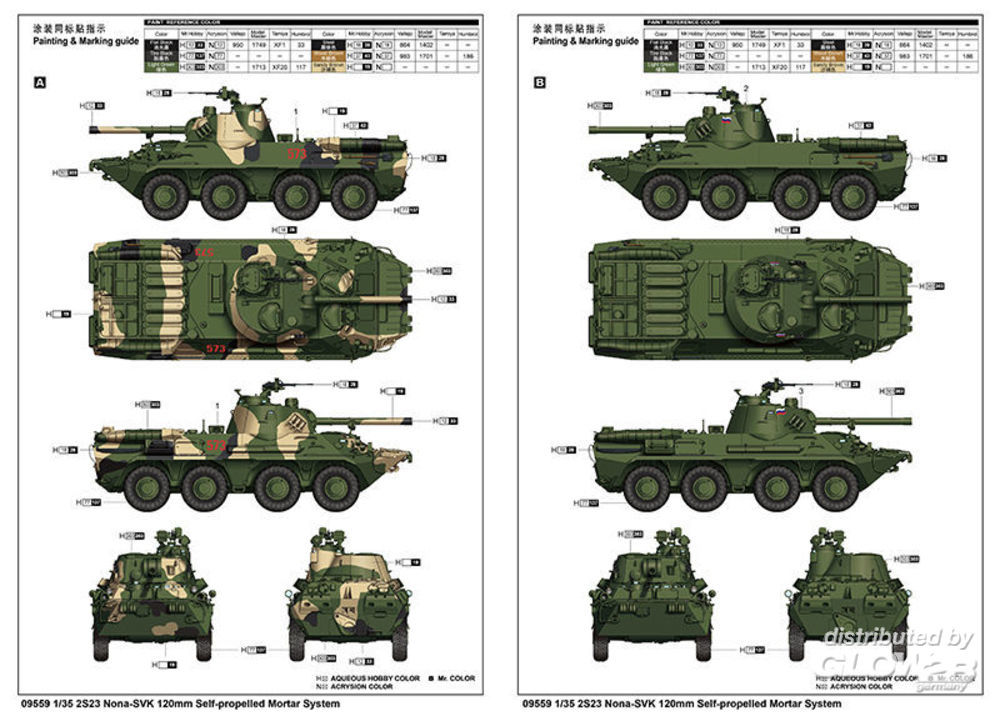 - feinen Details - Unteren Rumpf und oberen Rumpf - Gummireifen - mit Fotoätzteilen Russisches 2S23 NONA-SVK Feuerunterstützungsfahrzeug auf der Basis von extensiv modifiziertem Amphibienfahrzeug APR BTR-80 mit gezogenem Geschütz 120 mm 2A60 aus dem 2S9 NONA. Betrieben von einer Besatzung von 4 Personen. Wassergekühlter V-8-Motor. Reifenfüllsystem, Rüstungsschutz vorne und hinten. Ausgestattet mit Nachtsichtgeräten und Wärmebildgeräten. The kit consists of over 550 parts >the kit w/refined detail >multi-slide moulded turret, lower hull & upper hull >rubber tires >photo-etched parts included Russian 2S23 NONA-SVK fire support vehicle based on extensively modified BTR-80 amphibious wheeled APC with 120 mm 2A60 rifled gun/mortar from the tracked 2S9 NONA. Operated by a crew of 4. Water-cooled V-8 engine. Tyre inflation system. Armour protection front and rear. Fitted with night vision and thermal imaging devices. Zusatzinformationen