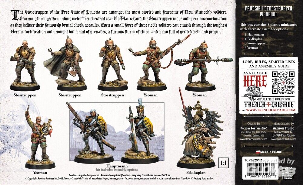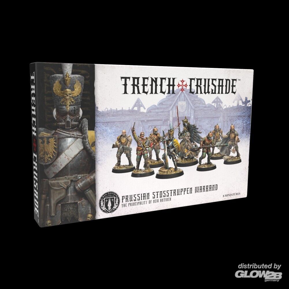 Die Stoßtruppen des Freistaates Preußen gehören zu den legendärsten und furchterregendsten Soldaten Neu-Antiochias. Wenn sie durch das verworrene Netz aus Schützengräben stürmen, das das Niemandsland durchzieht, bewegen sich die Stoßtruppen mit unvergleichlicher Koordination, während sie ihre berüchtigten, brutalen Sturmangriffe ausführen. Selbst eine kleine Einheit dieser edlen Soldaten kann die stärksten Befestigungen der Ketzer zerschmettern – allein mit einem Hagel aus Granaten, einem wütenden Schlaghagel von Keulen und einem Kiefer voller zusammengebissener Zähne und Gebet.